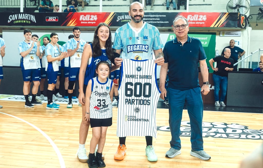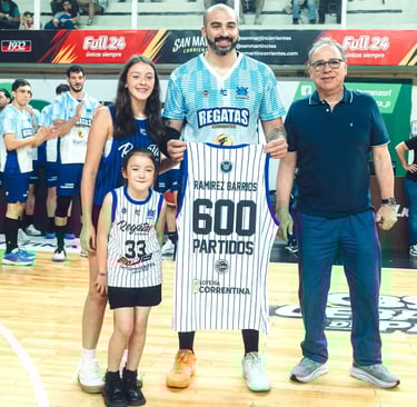 Previo al encuentro, el capitán “remero”, Fabián Ramírez Barrios, fue reconocido por alcanzar los 600 partidos en la Liga Nacional, de los cuales 223 fueron con la camiseta de Regatas Corrientes.